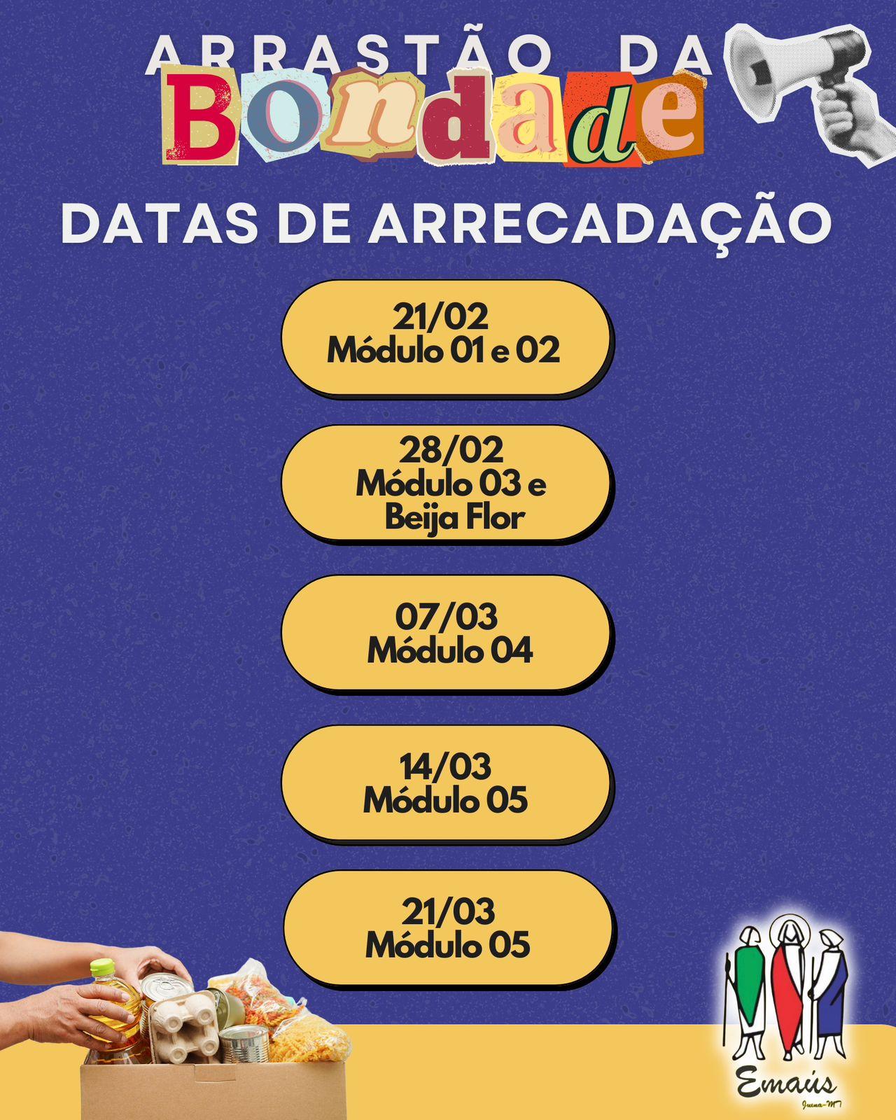 Começa neste sábado, dia 21, mais uma edição do Arrastão da Bondade, promovido pelo Movimento Emaús, em Juína. A ação solidária marca o período da Quaresma com a arrecadação de alimentos não perecíveis que serão convertidos em cestas básicas destinadas a famílias em situação de vulnerabilidade.